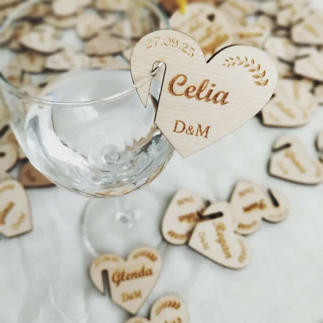 Maderas en forma de corazón con ranura pequeña para colocar en copas, vasos o carteles de mesas.