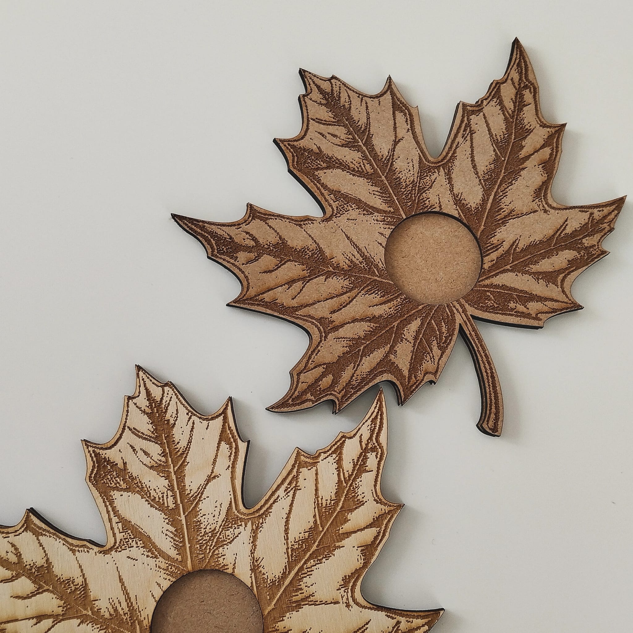 Pieza de madera en forma de hoja de arce cortada y grabada con un acabado natural. Disponible en dos tamaños y dos tonos, oscuro o claro.